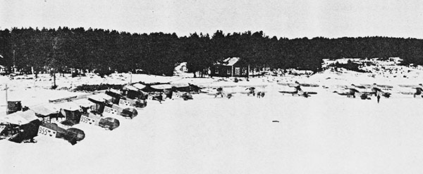 Med Phönixjagarna fick jaktflyget sitt genombrott. Här en bild från en av många vinterövningar där också flygplan av typerna Albatros och Tummeliten skymtar. Foto: Okänd. |
