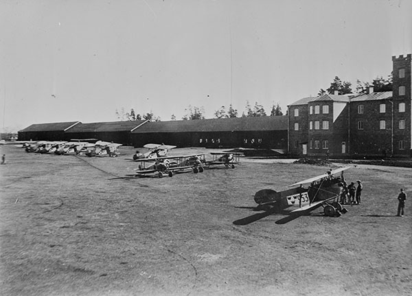 Flygkompaniet och Centrala flygverkstäderna Malmen, E- och F-hangaren. Till höger kanslihuset.