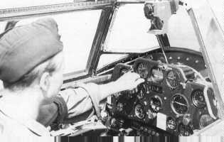 | Instrumenteringen i en J 21A-1. Hastighetsmätaren justeras. Detta flygplan är försett med en eldriven kurshorisontanläggning (det stora instrumentet till höger om centrum). Notera även utskjutningshandtaget för katapultstolen till höger. Foto: Okänd. |