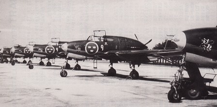 | J 21:or på linje vid 3:e divisionen F 9. Flygplanen har enligt traditionen försetts med divisionens signum: Den boxande getingen! Foto: Okänd. |