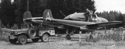 | "Gul Adam" (21160) från F 15 bogseras till en fältmässig uppställningsplats under fältövningen i Tierp i september 1948. "Gul Adam" var den första J 21 av typ A-2 (serie 2). Foto: Okänd. |