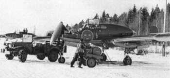| Vinterbild från F 6 där A 21 motorkörs samtidigt som vapen laddas. Notera raketställen under vingen, upphängda 50-kilos bomber samt den obligatoriska extrakylningen med vattenslang in i kylluftintaget. Foto: Ragnar Ignell. |