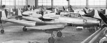 | Från sammansättningslinjen hos SAAB i Trollhättan. Ett antal 21A-2 i det närmaste färdiga för leverans. Notera arbetsnummer "63" på den närmaste maskinen. I bakgrunden några målade maskiner avsedda för F 15. Foto: Okänd. |