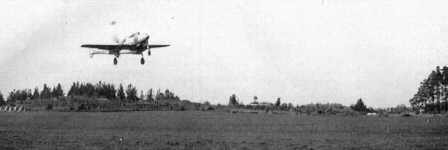 | En unik bild från en av de första provflygningarna med 21001 från SAAB-fältet. Maskinen är metallblank med kronmärken på framkroppen. Foto: Okänd. |