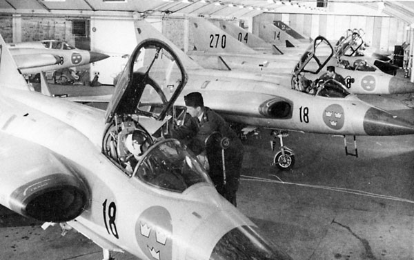 J 35B klargöres i bergshangaren vid F 18 i Tullinge. I bakgrunden ses även ett av flygplanen som brukades av uppvisningsgruppen "ACRO DELTAS". Foto: Se nedan. |