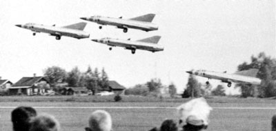F 18:s uppvisningsgrupp "ACRO DELTAS" flög J 35B och var flygdagsfavoriter under större delen av 60-talet. Här startar gruppen i samband med F 6 25-årsjubileum år 1964. Foto: Se nedan. |