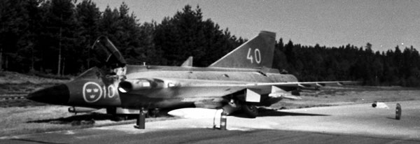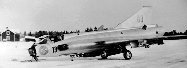 Sjön Roxen (Östergötland) | Vid leveranskontrollflygning kom fpl strax efter start in i en våldsam rotationsrörelse som inte gick att häva. Ff (pfl FC lt Lars-Erik Jetzen) o pass (SAAB ing Hans I Pettersson) räddade sig med fallskärm (J ryggskada). Fpl gick igenom isen på sjön Roxen men bärgades. Orsak: En roderlina till vänster vingroder hade kapats av ett fläkthjul (till kabinluftsystemet) som lossnat pga överhettning då en skyddslucka för ett luftintag troligtvis ej tagits bort före start. Drifttid 7,2 tim. (PL) |