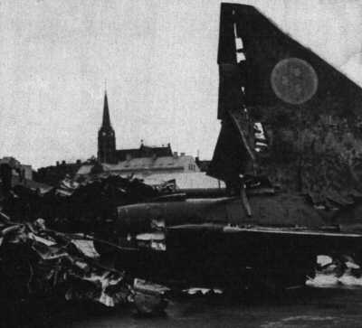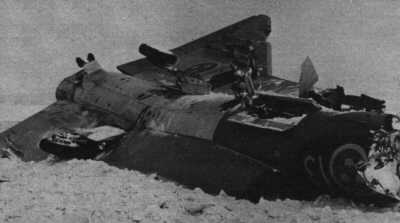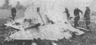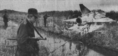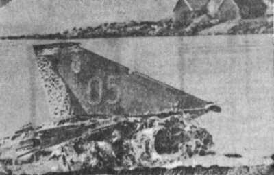 Fpl slog ned 100 m från land. (Exp) Ff (ffl.1 Jan A Björkman, GFSU:Ä) räddade sig med fallskärm. |