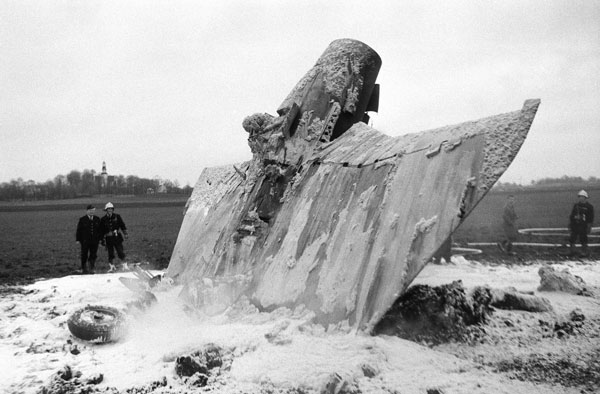 1966-11-18 havererade J 35D nr 35355 från F 3 vid landningen pga okontrollerat läge. Den österrikiske flygföraren räddade sig med fallskärm. Foto: Arne Gustafsson / Bild Linköping (CC BY-NC-ND). |