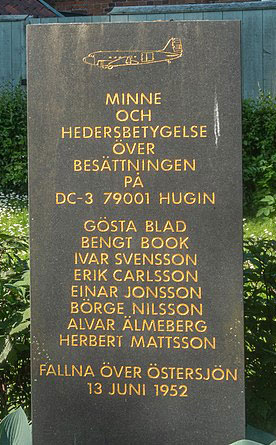 Minnessten över besättningen på DC-3:an som sköts ner 1952. Galärvarvskyrkogården på södra Djurgården. Foto: Frankie Fouganthin (Wikimedia CC BY-SA 4.0 beskuren). |